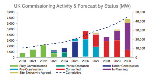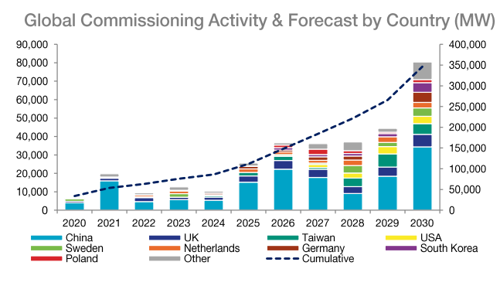 Global offshore wind operational capacity has increased by 21% over the last 12 months, from 61.5 gigawatts a year ago to 75GW today. China and the UK retain their top positions with 36.7GW and 14.7GW operational respectively. Germany is third with 8.3GW, the Netherlands fourth with 3.7GW and Denmark fifth with 2.7GW. The report states that global operational offshore wind capacity could reach 277GW by the end of 2030 - nearly a fourfold increase from today.