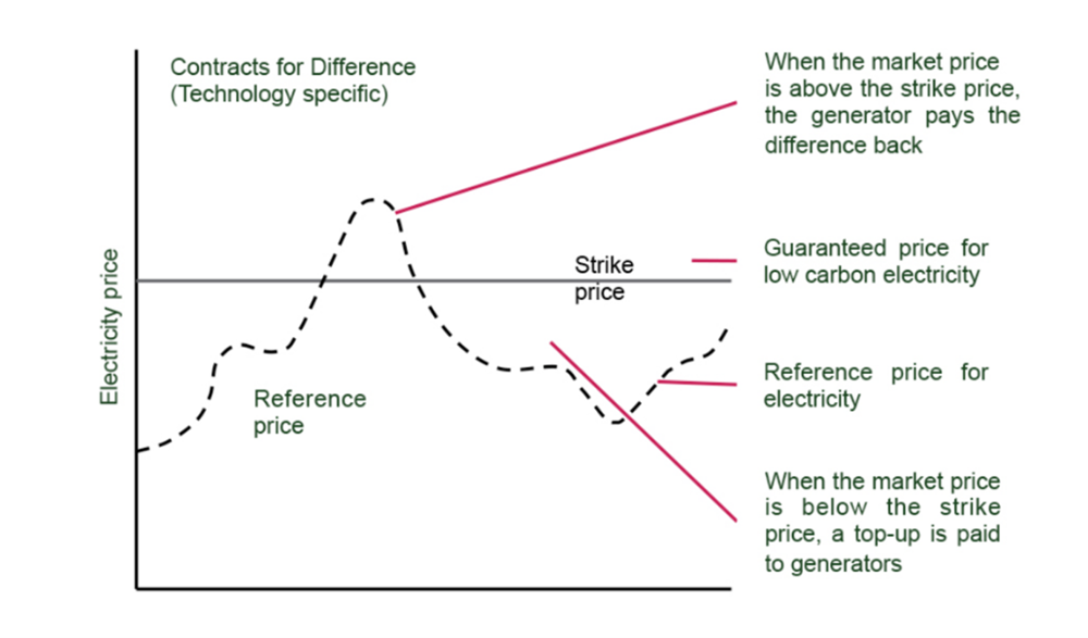 The CfD provides investors with certainty over the future of their investments, with a fixed price for each MWh of electricity they generate. Investors face inherent risks in volatile electricity markets. The riskier the project is seen to be, the more it costs overall to secure the financing from banks or investors for the project; the “cost of capital” is higher.