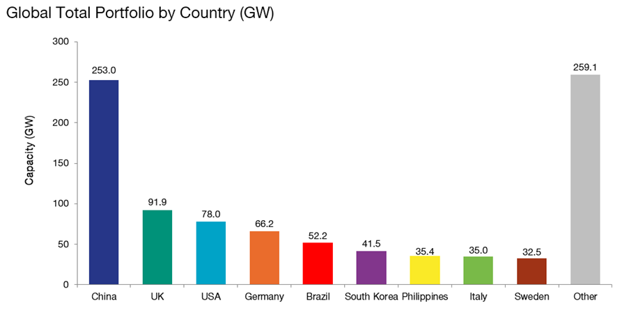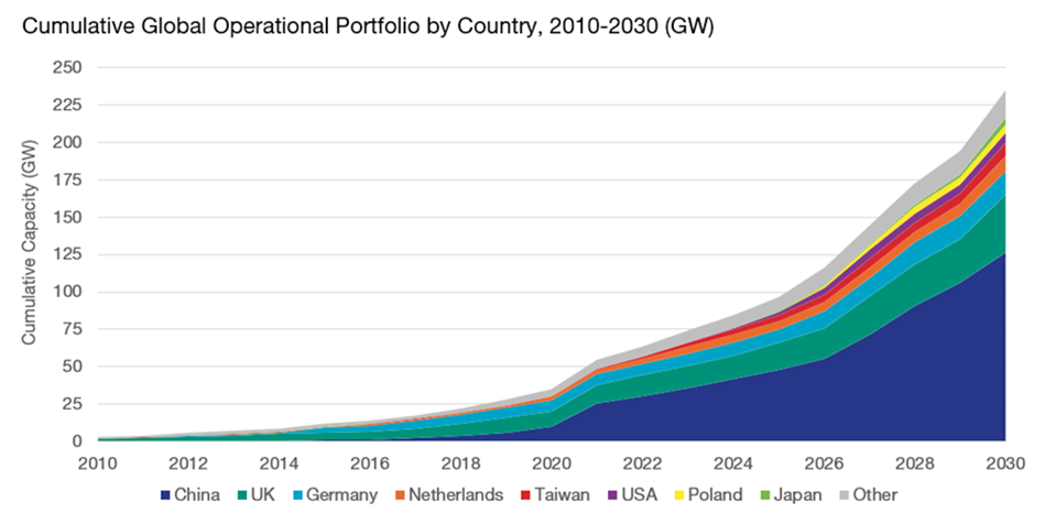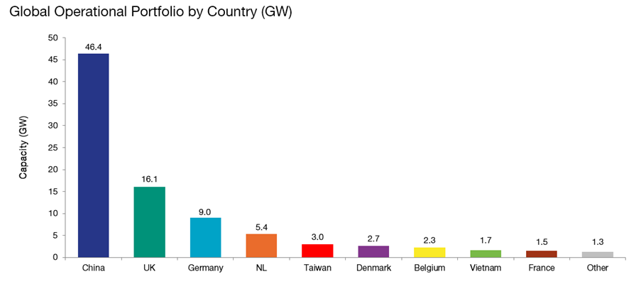 84% of offshore wind capacity which went operational over the last 12 months was in two markets: China and the UK, which still dominate the global portfolio: